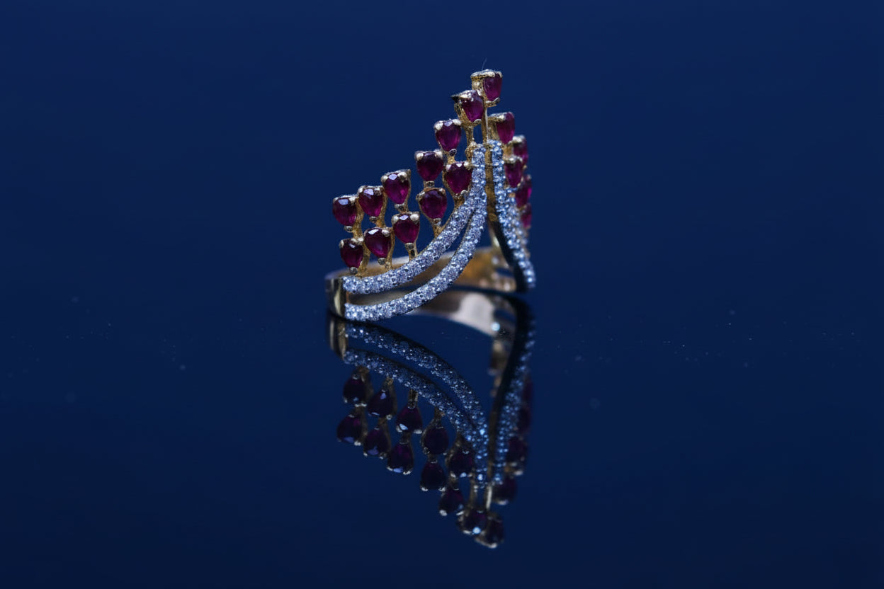 Elevate your presence with the Ruby Tiara, an exquisite crown-inspired ring that commands attention. Crafted from hallmarked 925 sterling silver and finished with rhodium plating, this statement piece features cascading ruby-toned stones arranged in a regal peaked silhouette. The brilliant-cut clear stone border amplifies the crimson hues, creating a luminous, fire-filled glow. Perfect for the woman who refuses to blend in—this is jewelry that speaks of confidence and timeless elegance.