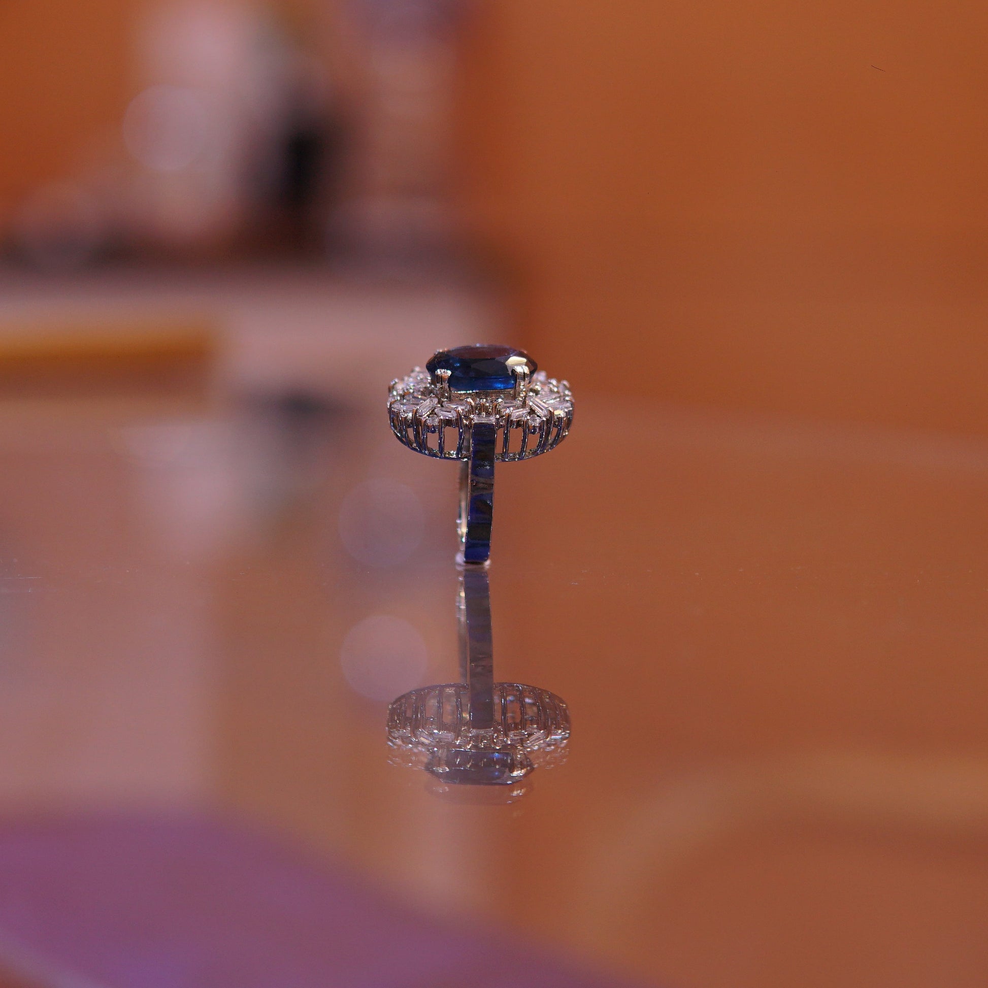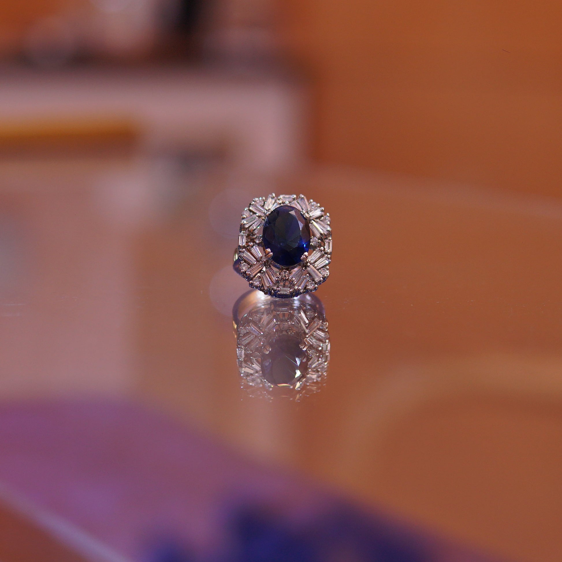 Vintage Grandeur. Midnight Brilliance. Step into a world of timeless luxury with The Azure Empress. Exclusively crafted for The Silver Atelier, this breathtaking statement ring features a majestic Ocal-cut sapphire-toned center stone, surrounded by a tiered architectural halo of shimmering accents. Inspired by royal heirloom jewelry, it is a piece designed to be the crowning jewel of your collection.