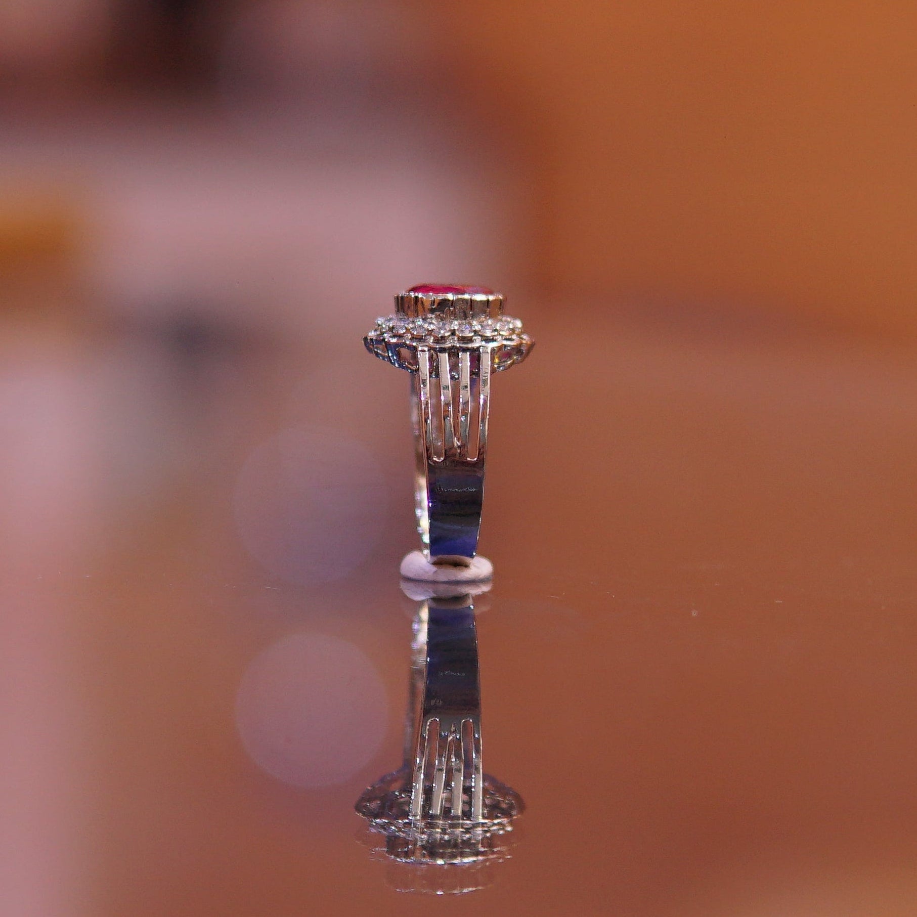 • Delicate Floral Halo: A meticulous arrangement of shimmering stones that creates a soft, blooming silhouette around the central ruby.