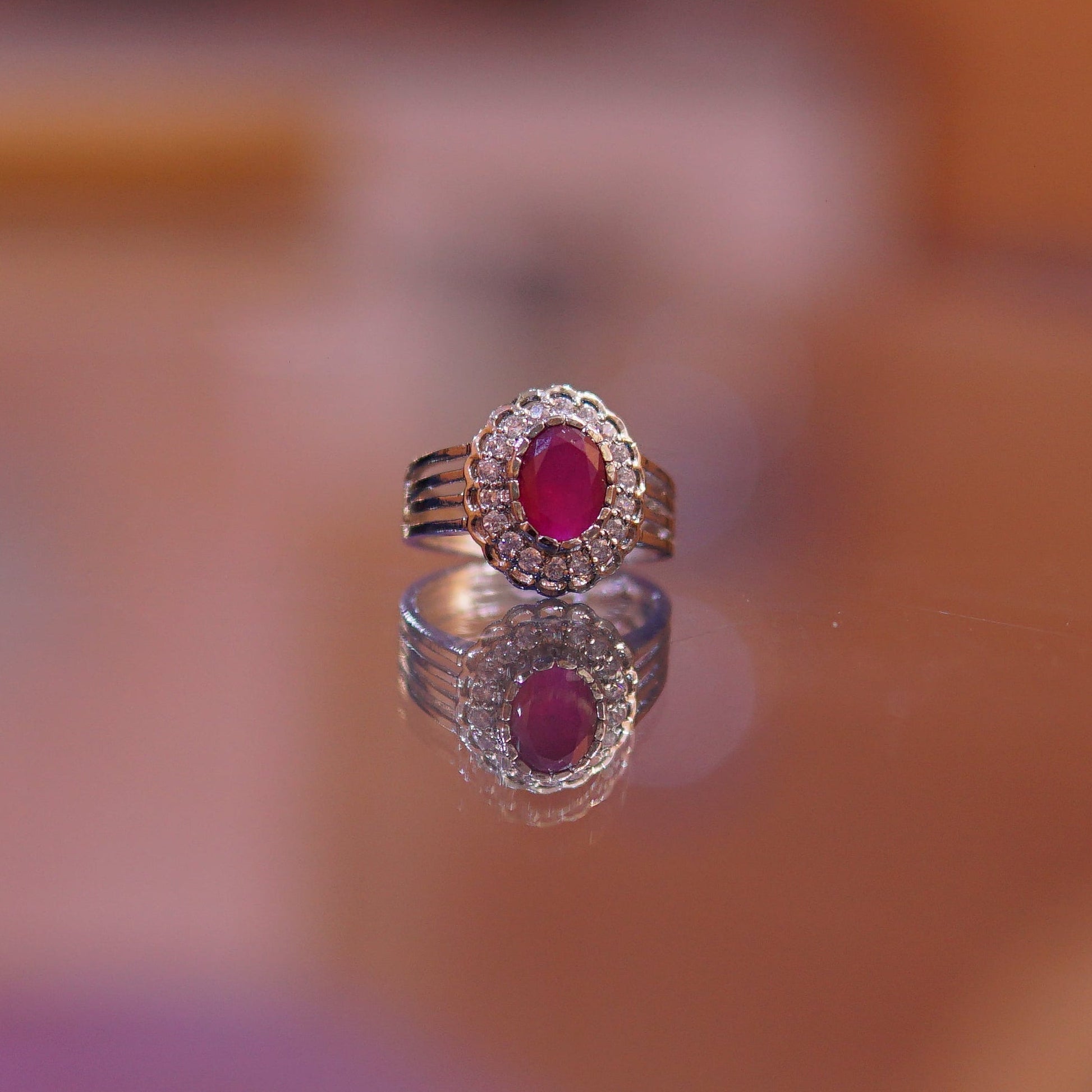 Vintage Charm. Everlasting Radiance. Embrace a look of timeless femininity with the Crimson Blossom Solitaire. Exclusively designed for The Silver Atelier, this piece features a rich, ruby-red center stone held in a classic prong setting. It is encircled by a delicate halo of brilliant-cut accents that mimic the soft petals of a flower, creating a graceful fusion of nature-inspired design and royal sophistication.