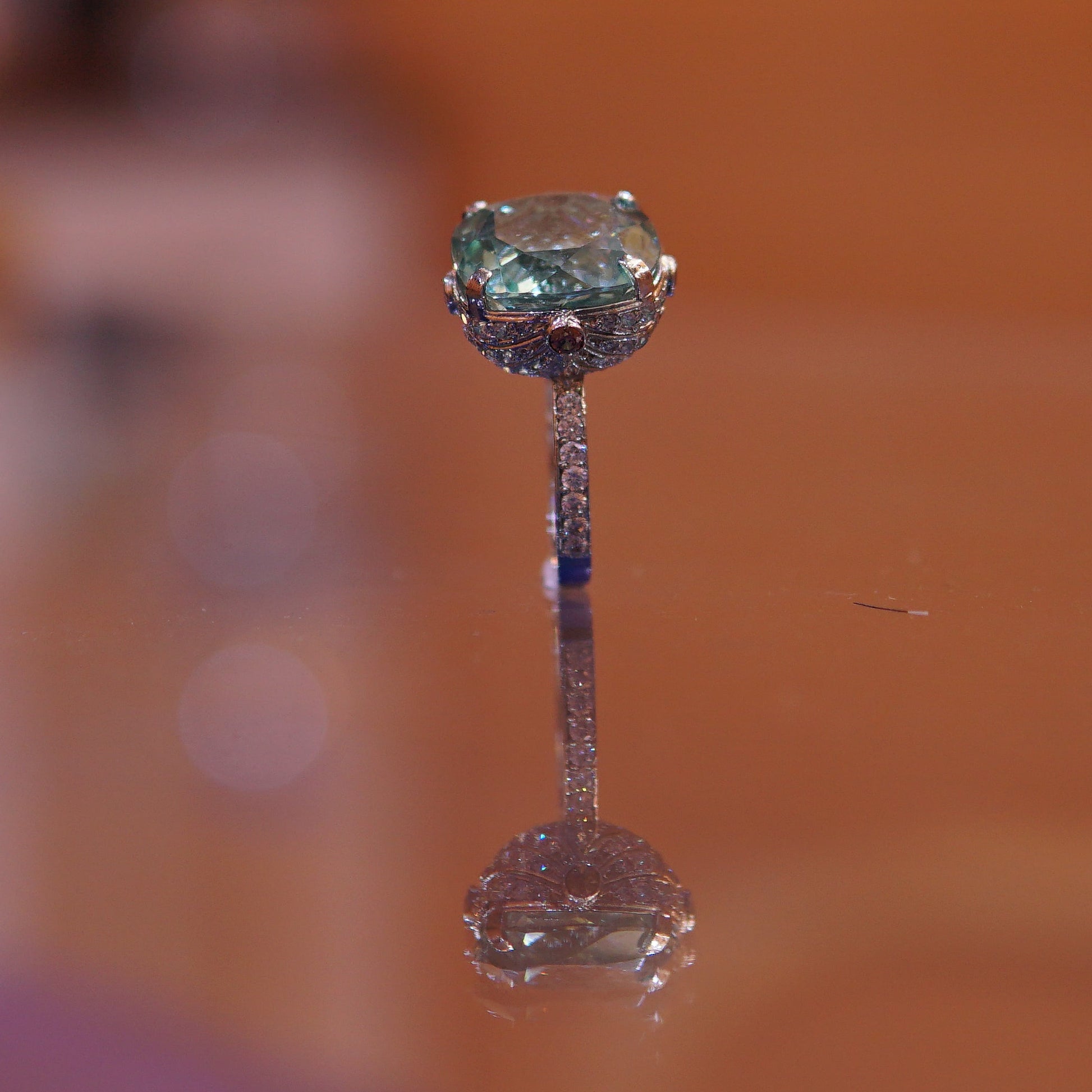 Ornate Basket Setting: The center stone is supported by a rich, multi-dimensional frame adorned with micro-pavé work and hidden architectural details.