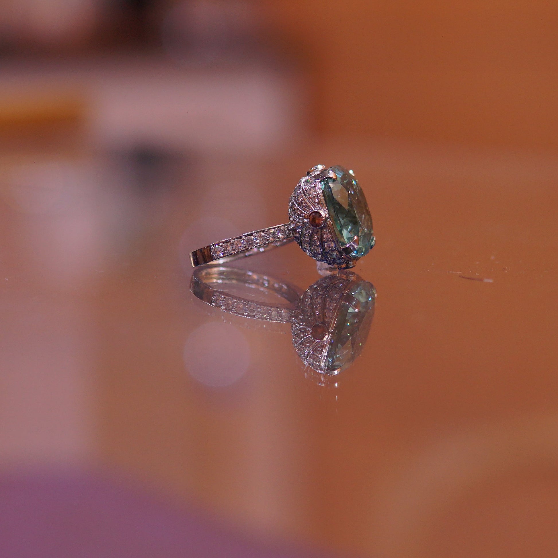 Grandeur Unimagined. Royal Sophistication. The Aquamarine Majesty is the crown jewel of The Silver Atelier’s statement collection. This breathtaking ring showcases a massive cushion-cut aquamarine-toned centerpiece, held by an intricate, stone-encrusted basket setting. It is a piece designed for the woman who seeks a red-carpet presence and timeless heritage style.