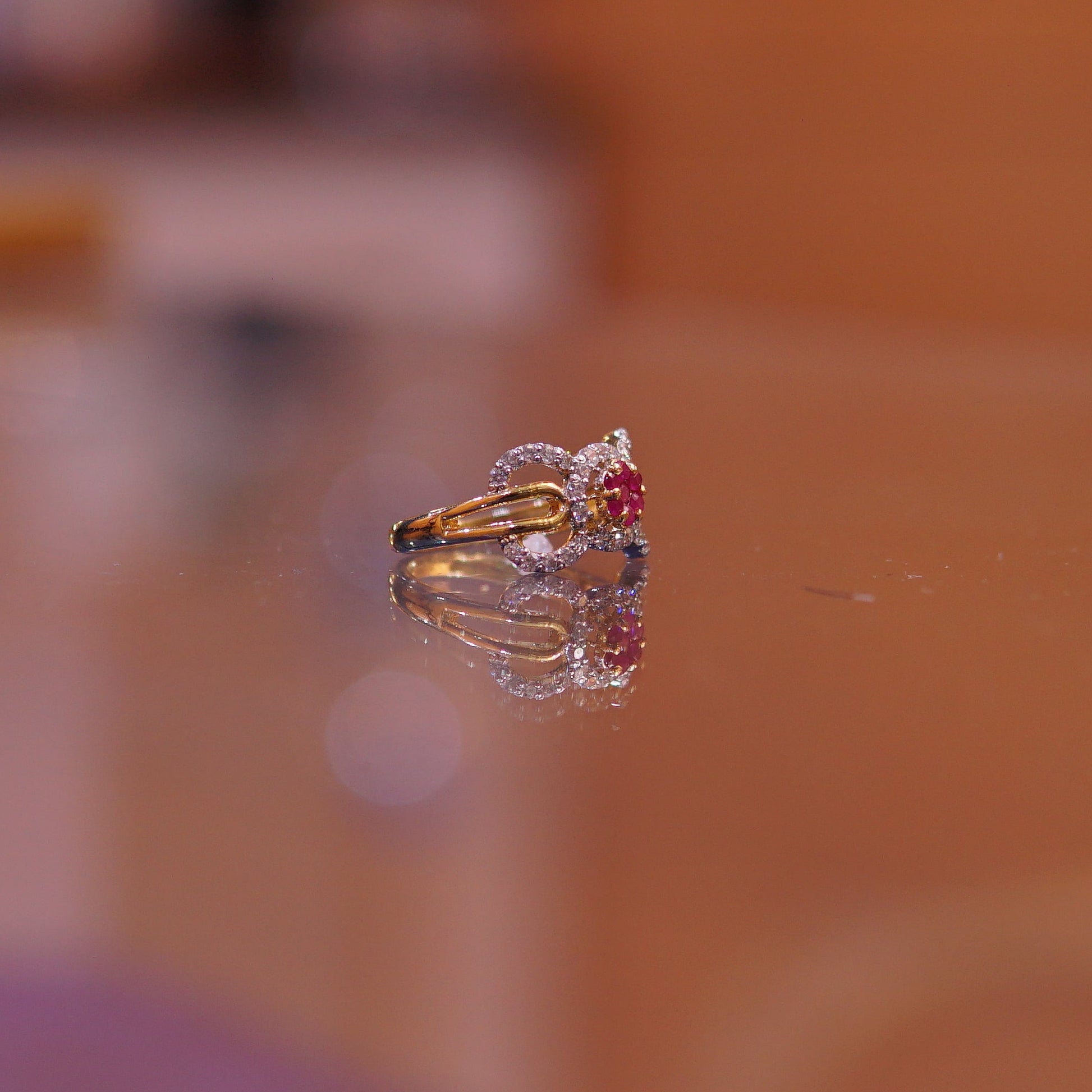 A Bloom of Timeless Brilliance. Celebrate the delicate beauty of nature with the Radiant Rose Solitaire. Exclusively curated for The Silver Atelier, this ring features a stunning floral cluster of vivid rubies, set within an intricate halo of shimmering accents. With its unique split-gold-tone inner band and high-polish silver exterior, it is a masterpiece of two-tone elegance.