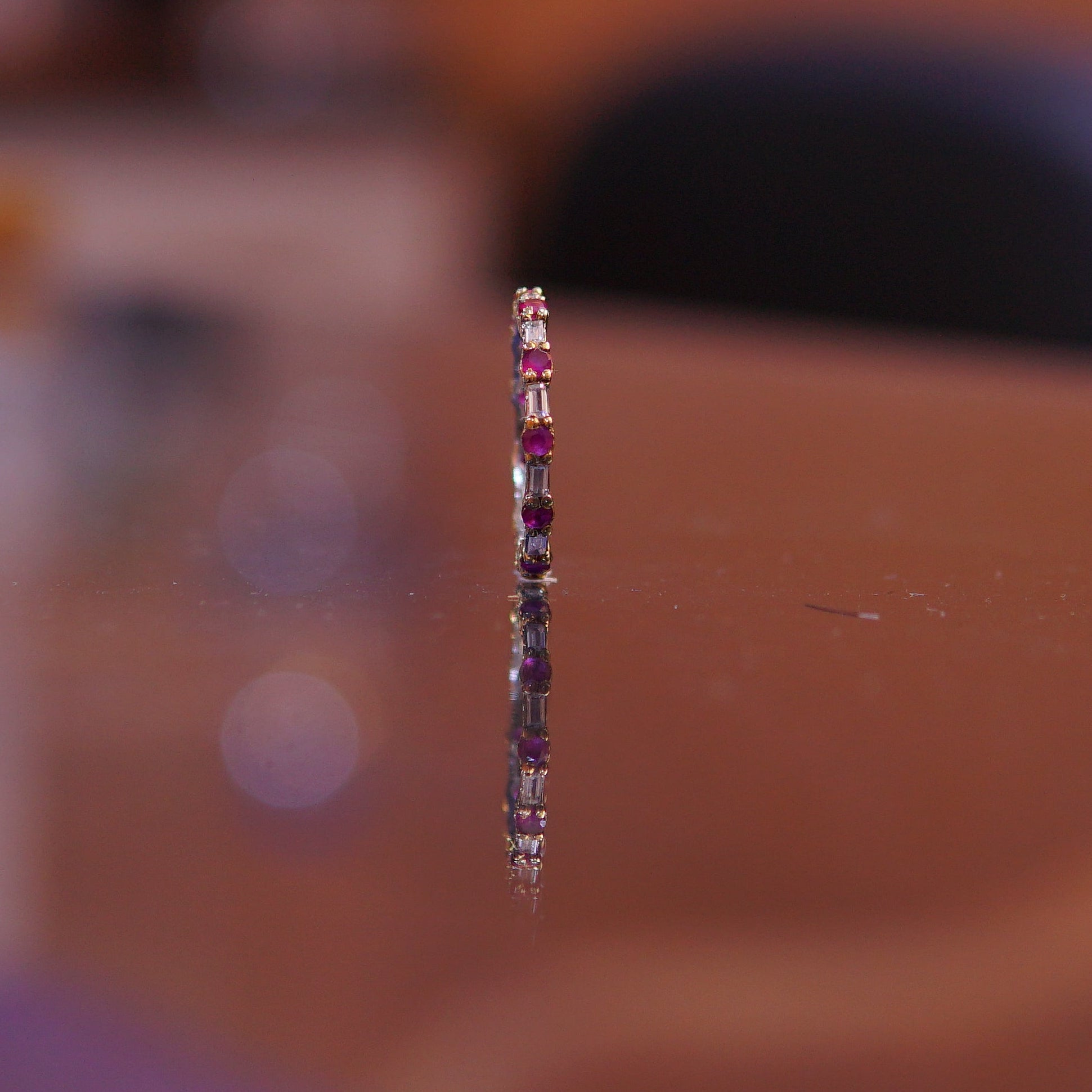 Bold Elegance. Timeless Artistry. Ignite your jewelry collection with the Crimson Symphony Band. Exclusively designed for The Silver Atelier, this masterpiece features a captivating alternating pattern of vivid, round-cut rubies and sleek, architectural baguette-cut stones. It is a modern tribute to classic glamour, offering a rhythmic play of color and light that wraps your finger in pure luxury.