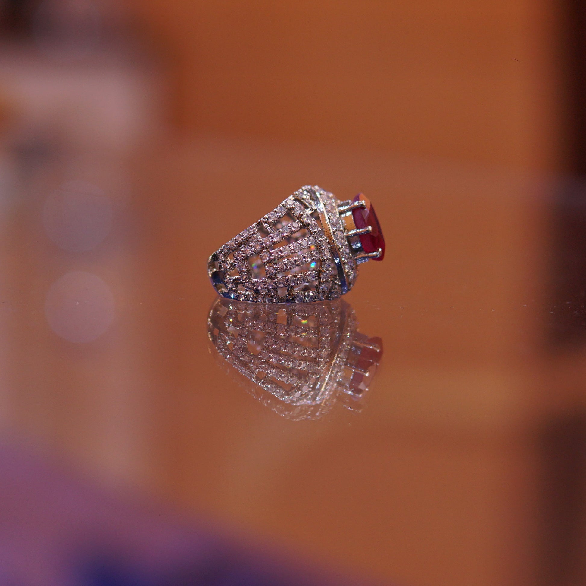 Vibrant Ruby Focal Point: A rich, oval-cut ruby-toned stone sits at the peak, radiating deep color and exceptional brilliance.