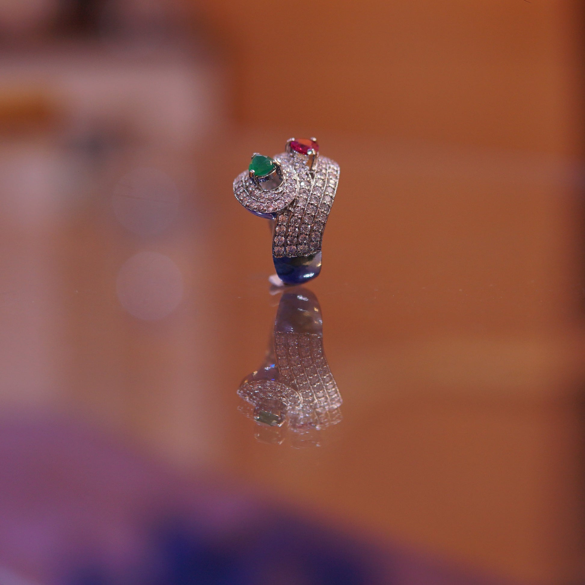 A Harmonious Fusion of Passion and Prosperity. Redefine modern luxury with the Eternal Bond Bypass, a striking interpretation of the classic "Toi et Moi" (You and Me) design. Exclusively available at The Silver Atelier, this ring features two vibrant, pear-cut gemstones—a lush emerald green and a deep ruby red—nestled together in a sophisticated wrap-around silhouette. It is a bold celebration of contrasting colors and unified elegance.